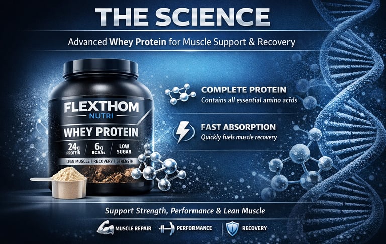 Flexthom Nutri Whey Protein is formulated to deliver clean, efficient protein support to help your body rebuild and maintain lean muscle—supporting strength, performance, and an active lifestyle with every serving.